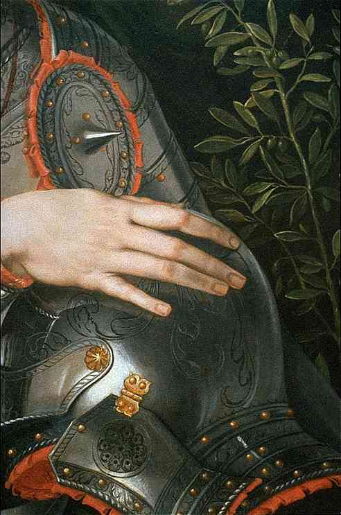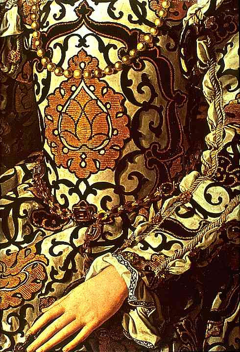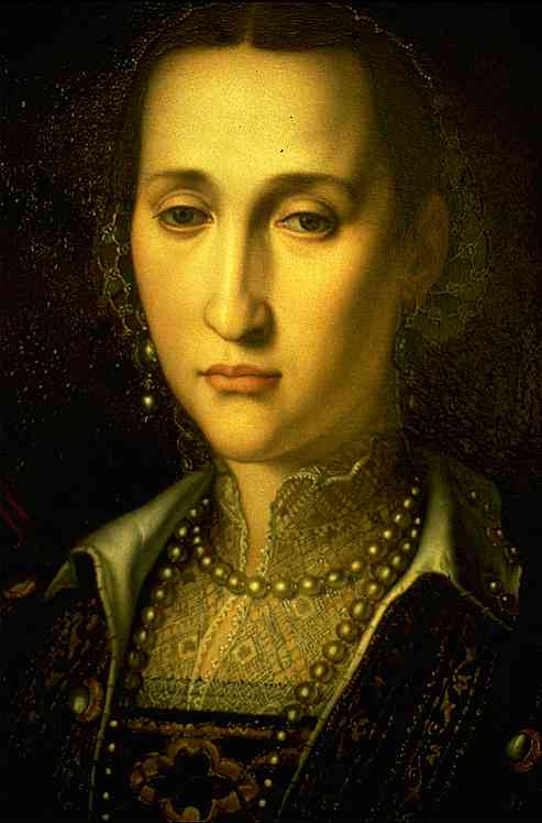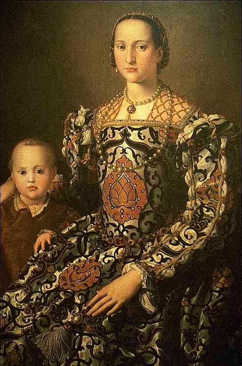 She constantly imagined herself dead and wanted to be painted as a corpse in her coffin. She died of a fever, as did most of the Medicis, before reaching the age of forty. The extraordinary thing is that in 1982, twenty years after Chastel's statement, Florence opened the Medici tombs and was stupefied to discover that Eleanor of Toledo had been buried in that same dress. Her embalmed body and her gown with the chain around her waist were found in a fabulous state of preservation. The incredible pearl necklace was not there. These are the famous Medici pearls which were later worn by all those women whose lives ended badly, including Marie-Antoinette. The pearls are cursed...