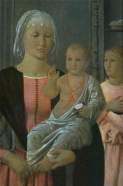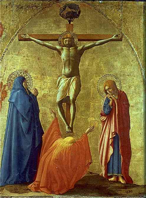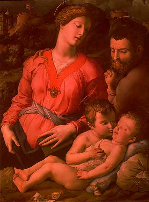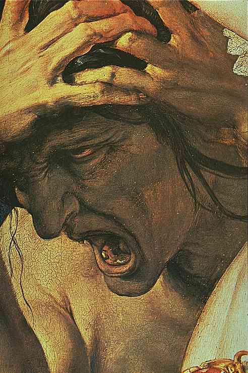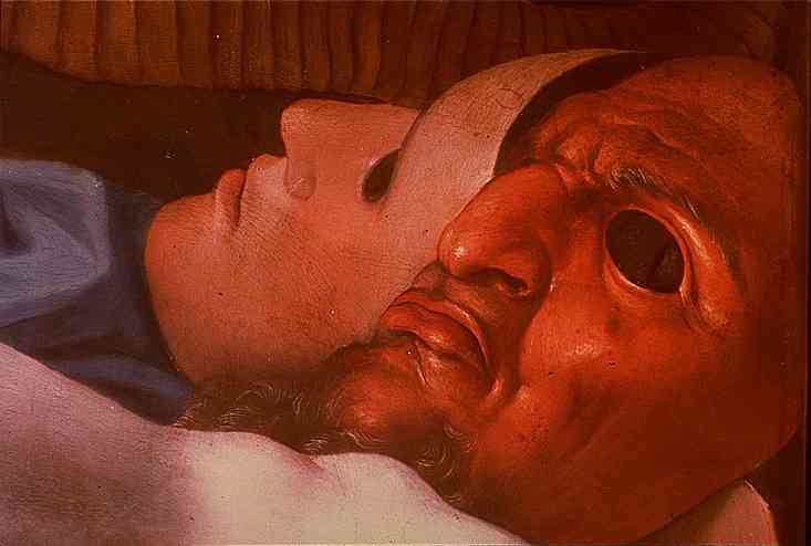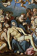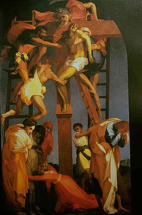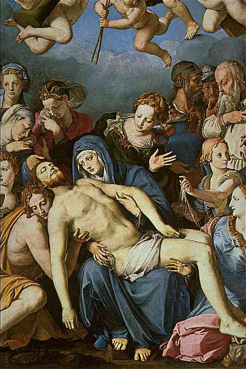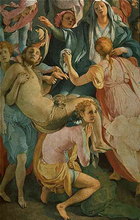 This deposition is in Florence, in the Santa Felicità church, in the Caponi chapel, where the work is surrounded by the four tondi by his student, Il Bronzino. Pontormo was the painter of the ethereal.Christ's body weighs nothing, the persons supporting him are only standing on one toe. All the drapes were created in order to further increase this visual impression. Pontormo was a visionary, while Il Bronzino was a pragmatic witness of his era. What is a bodily presence for Il Bronzino is, for Pontormo, an absence, a shadow. We shall delve into this work, as the more closely one looks at it, the more one is convinced that Pontormo is one of the strangest painters of his time and one of the most captivating. Christ's face is completely devoid of existence, of any presence. The Virgin's face is washed out by her liquid veil; the veil and the dress are one and the same. The ambiguity has so transformed her into a stream of pain, that one can no longer make out where the dress starts and the flesh ends. Mary Magdalene is more present, but her gaze has an uneasy look to it. Christ's bearers: the one on the far right, in olive and red, the one on the bottom, the only one looking at us; very strangely, he is staring straight at the spectator; the face of the last one, the one holding Christ's right arm, brings that of Christ to mind, younger and again painted with this same feeling of a washed-out brush.