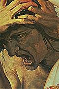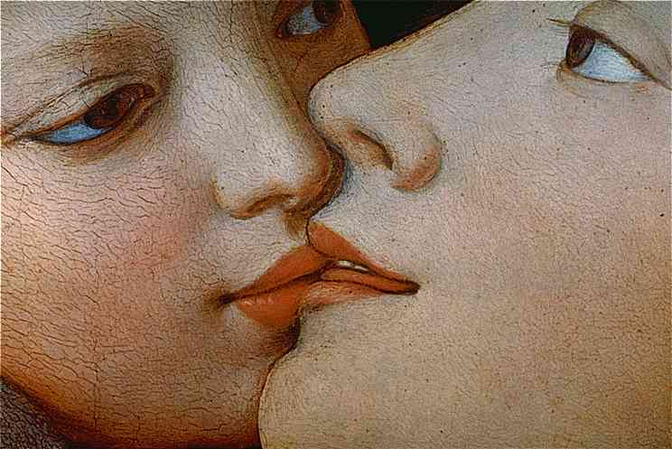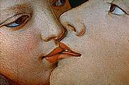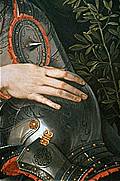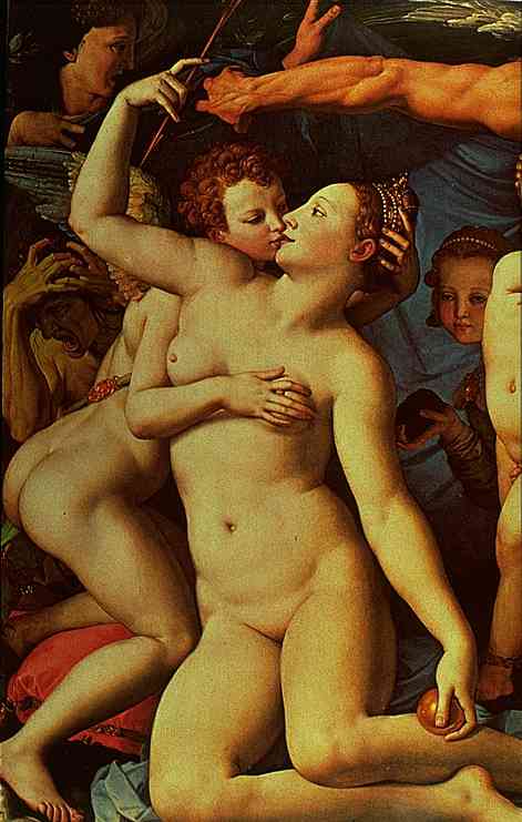 This painting shows Venus being kissed, nearly raped, by her own son, Cupid. Venus is sacrificing herself so that he cannot see the apple which she received from Paris (the beginning of the mythological original sin, as it was the beginning of the Trojan War). She is trying to hide his own arrow, to prevent him from continuing to wreak havoc. The mother is attempting to divest powers from her son, who is becoming too insistent. Around Venus and Cupid, there is a whole series of characters representing thewoes and joys of love. Il Piacere or Pleasure, which Il Bronzino took pleasure inpainting as a Hellenistic dancing satyr. Treachery is hiding behind him, withthe prettiest possible young girl's face, the prettiest little multicoloreddress, but which reveals a snake's tail, as she is, naturally, half snake andhalf woman. In one hand, she holds a honeycomb, in the other, an asp. Pleasureand pain at the same time. The two hands are reversed: her right hand is a lefthand, her left hand is a right hand...