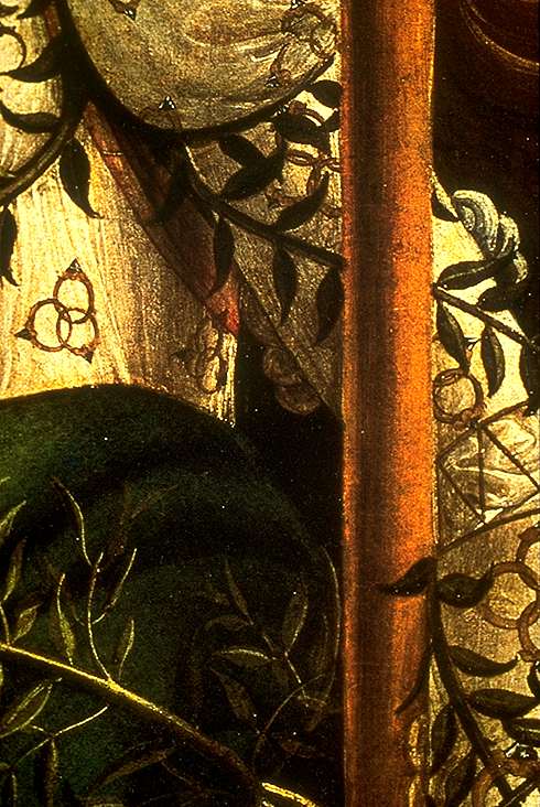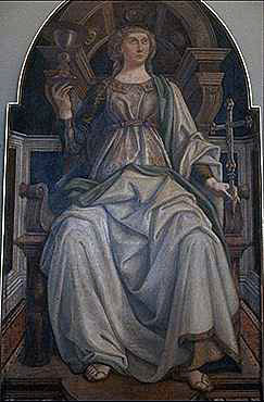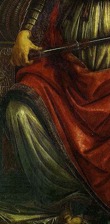 From the start, it should be pointed out that this is the same forest, the same trees, the same foliage, the same spacing between the trees, the same land, the same ground, the same flower patches. In other words, Venus was born and landed in this second painting which is Spring - it is the continuation. We still find her as the composition's central focus, but dressed as a sovereign. From the profane Venus we saw earlier, nude, we now progress to the sacred Venus, dressed as a matron in the noblest sense of the term. As such, she is truly the patron saint of the forces and elements and is surrounded by everything she needs to triumph over the twelve months of the year, the four seasons and, thus, eternity.
