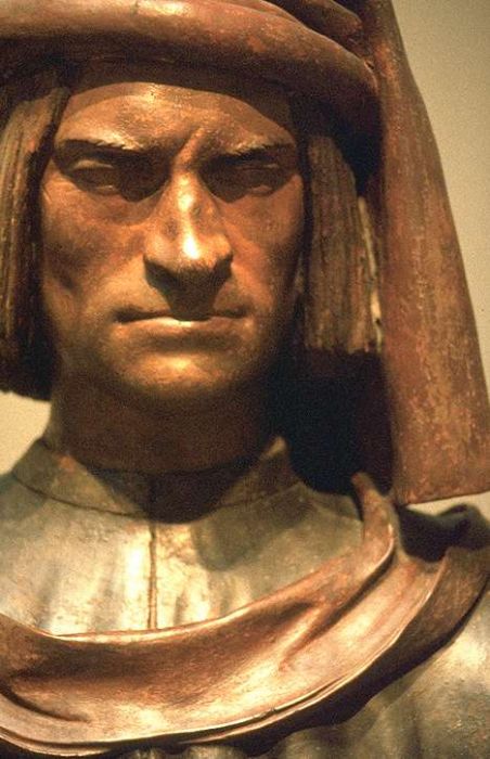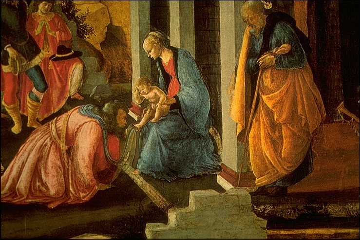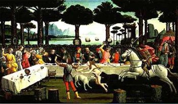It should be recalled that we are in Florence of the 1480's where artists clustered around the princes, the Medicis in particular, but also the Vespuccis, the Tornabuonis, etc., Botticelli and the others as well as the humanists This new race of humanists cannot be forgotten, these men of science whose mission was to make the past live again, to translate Virgil, Homer, Hesiod and Pindar and to update them. These humanists were surrounded by their disciples, the great thinkers and philosophers, and all these people lived together. Every day, Lorenzo the Magnificent assembled these humanists and artists and, together, much like a literary society led by Prince Apollo, the art of Florence was created, and the humanists' ideas were then translated by the artists, painters, sculptors, goldsmiths and musicians. Several generations later, musical Neo-Platonism was born. We know that this Birth of Venus and Spring, which is its direct continuation, was launched as an idea by Lorenzo the Magnificent himself, set to verse by his favorite humanist, Ange Poliziano, interpreted by the tiny genius, Pico della Mirandola, approved by the patriarch, Marsilio Ficino, and the notebook was wrapped up for delivery to Botticelli. It went from Lorenzo the Magnificent to all of Florence's humanism of this second half of the 15th century to finally be given to Botticelli, who thus scrupulously followed a text: the profane Birth of Venus and the coronation of the sacred Venus. It was written by Ange Poliziano, based on an ode by Hesiod, and the work was, in fact, paid for by Lorenzo di Pierfrancesco. We shall now see the two paintings, but one can only hope that, one day, they will be arranged side by side so that they can be shown on a single slide.