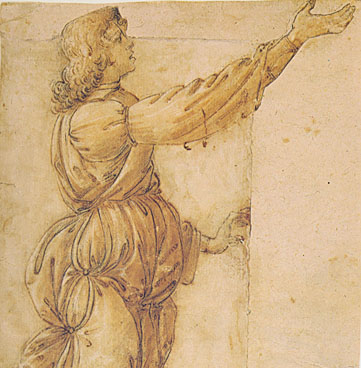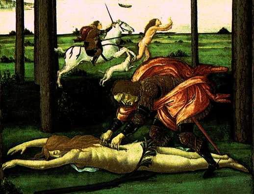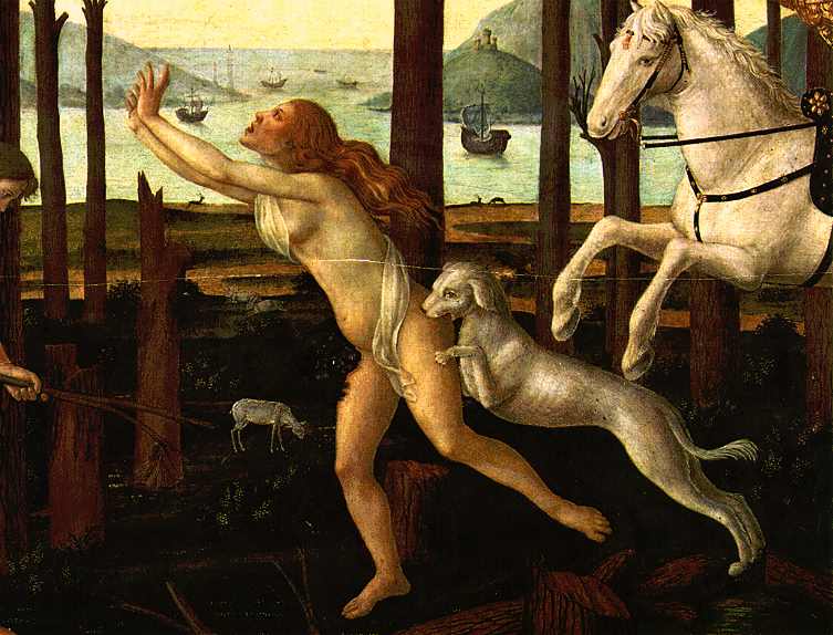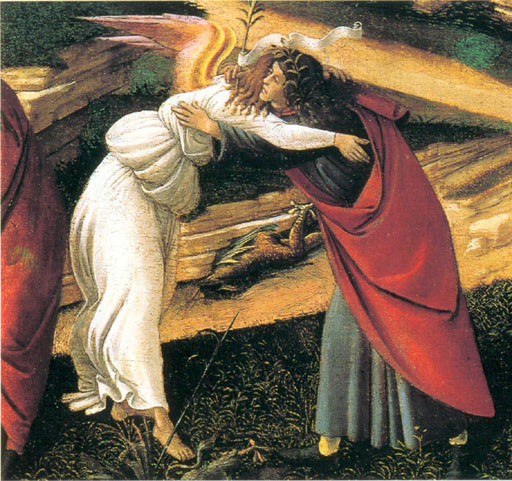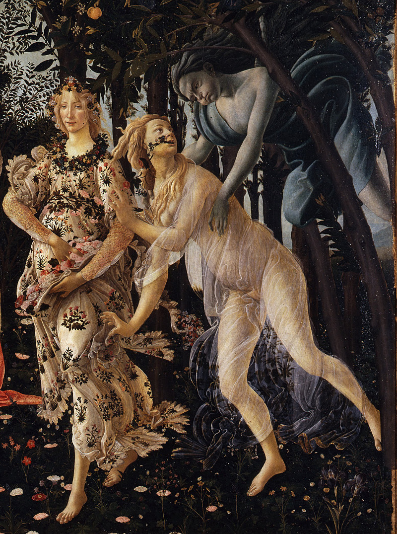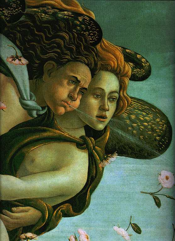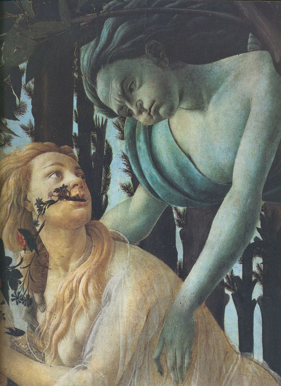 Chloe, pursued by Zephyr who, in both instances has the same distended cheeks; in one case, he is blue, this is the winter Zephyr, in the other, the Birth of Venus, he is nearly yellow, this is the spring Zephyr.