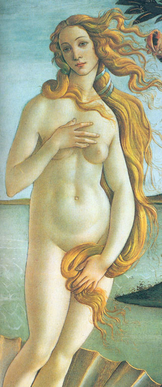 We see the story's birth with the winds, Zephyr and Aura, who, on the first day of Creation, elevated this shell bearing Venus' triumphant nudity from the unknown depths of the sea. And, approaching the earth on which she will assume her true role, her true power, she is suddenly modest, and we should note the stance, which Botticelli borrowed directly from the beautiful examples of the antique Venus Pudicae that were being discovered at that time. He really painted her like a Venus Pudica. For this modesty to take on its sacred nature, one of the Graces, in the name of all three, is there to cover her with her cape.