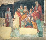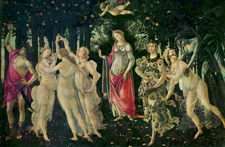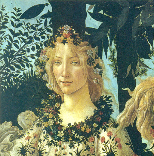 What is absolutely extraordinary, if one thinks back to the Birth, is that we have Zephyr, Venus and a Grace in the first painting, and here, we have Mercury, the Graces, Venus, Flora, Chloe and Zephyr. It all begins and ends with Zephyr; the two paintings thus form a complete cycle of seasons - winter, spring, summer and autumn. This was all done in order to show us nature's cycle which is so inherent to the Hesiodic Neo-Platonic inspiration for people such as Marsilio Ficino, Pico della Mirandola and others who dreamed of that period. But it also shows us the primacy of sacred love, as it is incarnated here, over profane love, over the fragility of the water and the shell in the preceding work. In fact, all the allusions could be studied at much greater length to show all the similarities between the two paintings. For the time being, let's take a walk through Spring.
