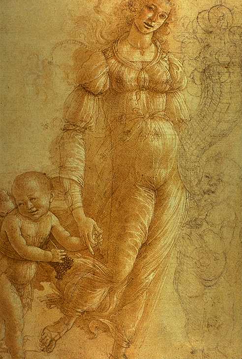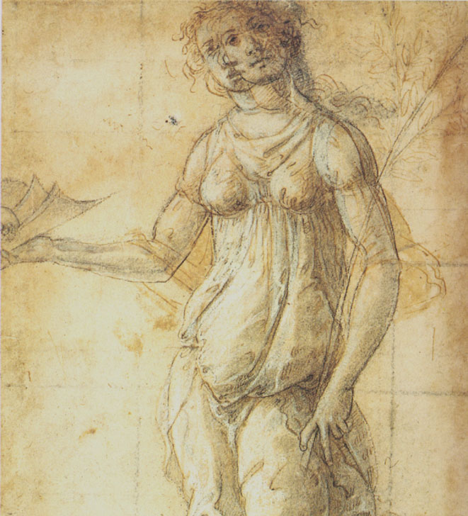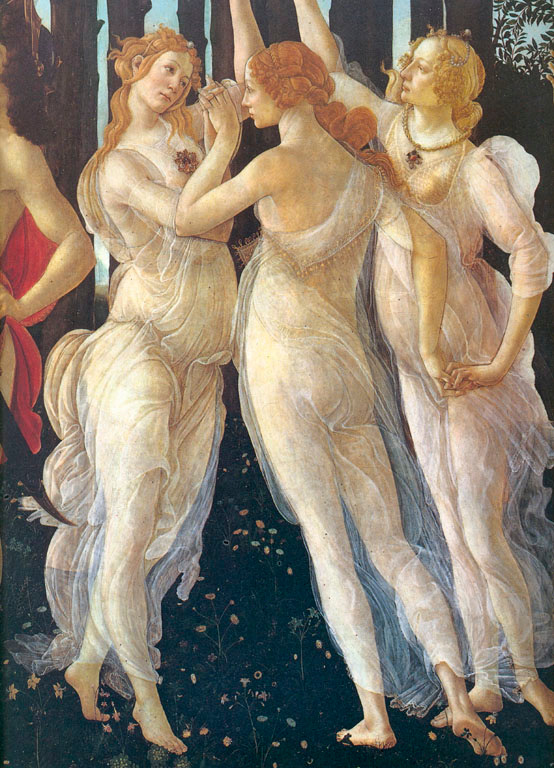Venus in the center of the composition, in this nearly solemn pose she has assumed, a matron presiding over the year, as it develops with the character of Flora, one of the loveliest details of Spring, and