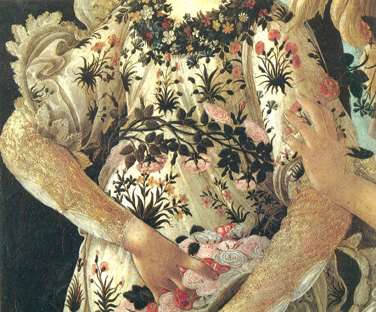 Flora's robe which is like a rendering of the Grace's robe in the Birth of Venus. All of her movements are also the result of a deliberate distortion of the flowers and the bouquet of flowers she is preparing to throw to the world. Finally,